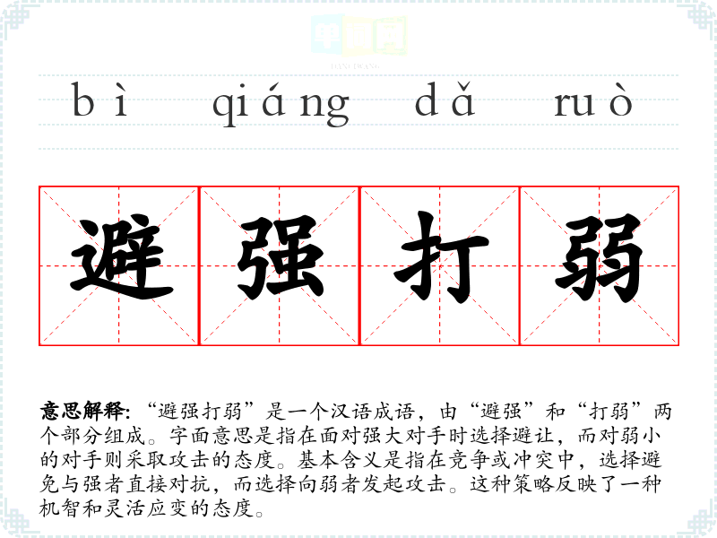 “避强打弱”是一个汉语成语,由“避强”和“打弱”两个部分组成。字面意思是指在面对强大对手时选择避让,而对弱小的对手则采取攻击的态度。基本含义是指在竞争或冲突中,选择避免与强者直接对抗,而选择向弱者发起攻击。这种策略反映了一种机智和灵活应变的态度。