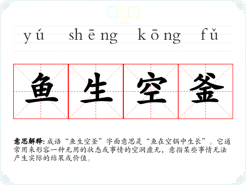 成语“鱼生空釜”字面意思是“鱼在空锅中生长”。它通常用来形容一种无用的状态或事情的空洞虚无,意指某些事情无法产生实际的结果或价值。