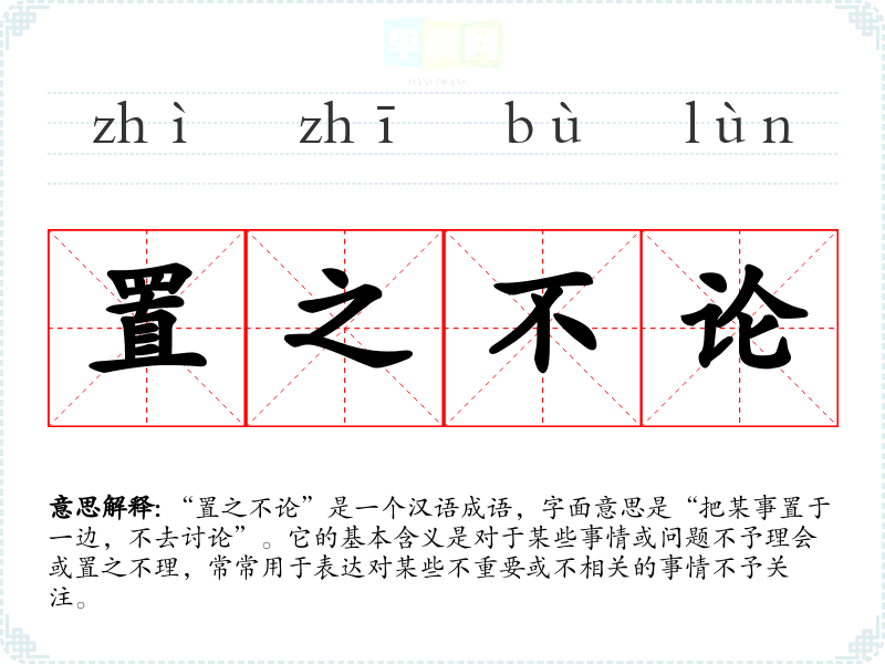 “置之不论”是一个汉语成语,字面意思是“把某事置于一边,不去讨论”。它的基本含义是对于某些事情或问题不予理会或置之不理,常常用于表达对某些不重要或不相关的事情不予关注。