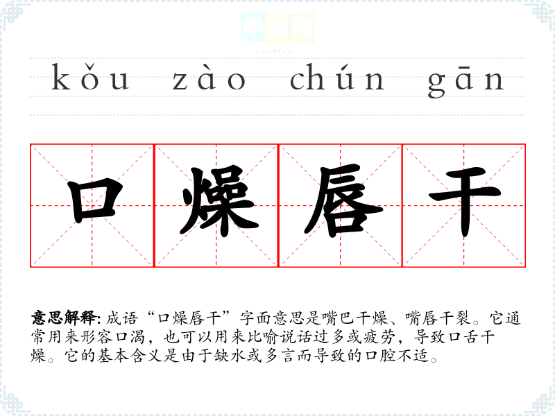 “口燥唇干”的来源并没有明确的历史典故,但它的构成字面上可以追溯到古代文人的生活状态,尤其是在长时间的学、写作或讨论中,常常会因为集中精神而忽略饮水,从而出现口燥唇干的现象。这个成语反映了人们在学和工作中的一种常见状态。