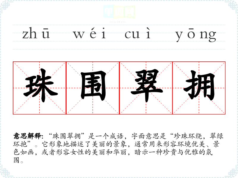 “珠围翠拥”给人一种温馨、优雅的感觉,联想到宁静的自然环境和优雅的人物形象。它不仅仅是对外在美的描述,也可能引发对内心宁静、和谐生活的向往。