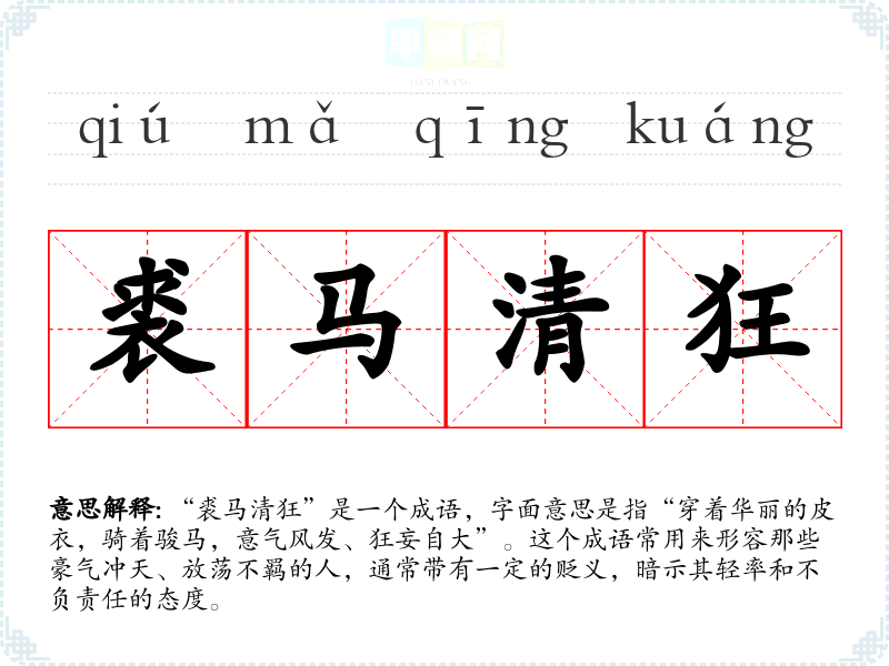 “裘马清狂”是一个成语,字面意思是指“穿着华丽的皮衣,骑着骏马,意气风发、狂妄自大”。这个成语常用来形容那些豪气冲天、放荡不羁的人,通常带有一定的贬义,暗示其轻率和不负责任的态度。