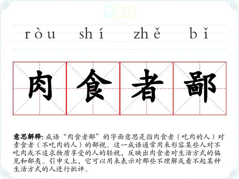 成语“肉食者鄙”的字面意思是指肉食者(吃肉的人)对素食者(不吃肉的人)的鄙视。这一成语通常用来形容某些人对不吃肉或不追求物质享受的人的轻视,反映出肉食者对生活方式的偏见和鄙夷。引申义上,它可以用来表示对那些不理解或看不起某种生活方式的人进行批评。