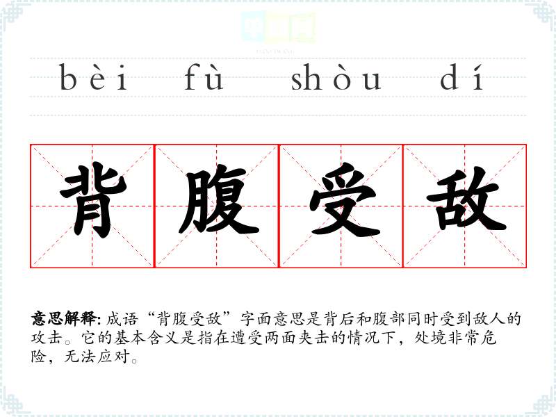 成语“背腹受敌”字面意思是背后和腹部同时受到敌人的攻击。它的基本含义是指在遭受两面夹击的情况下,处境非常危险,无法应对。