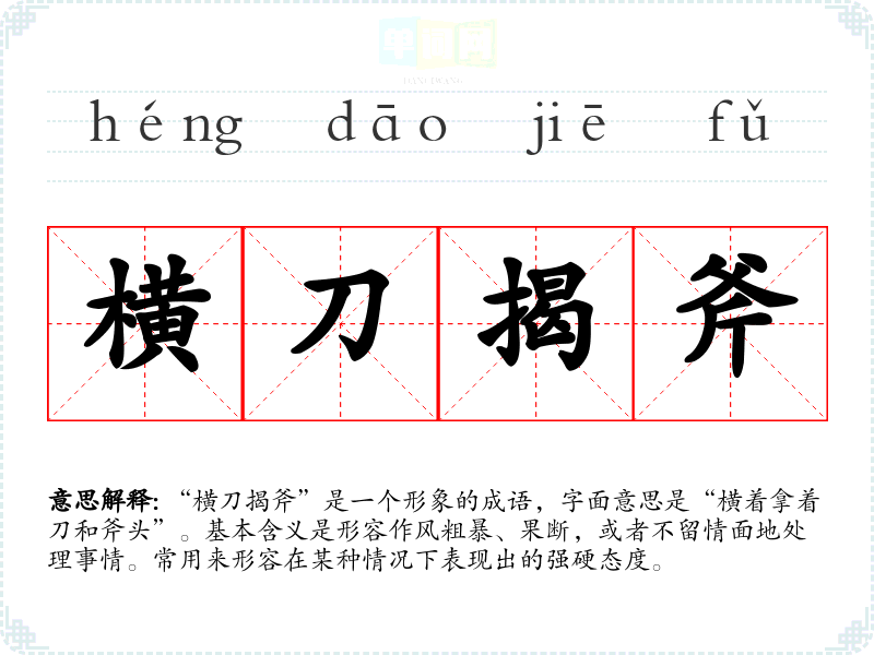 “横刀揭斧”是一个形象的成语,字面意思是“横着拿着刀和斧头”。基本含义是形容作风粗暴、果断,或者不留情面地处理事情。常用来形容在某种情况下表现出的强硬态度。