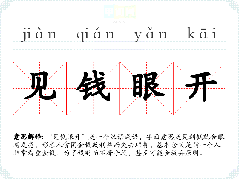 “见钱眼开”是一个汉语成语,字面意思是见到钱就会眼睛发亮,形容人贪图金钱或利益而失去理智。基本含义是指一个人非常看重金钱,为了钱财而不择手段,甚至可能会放弃原则。