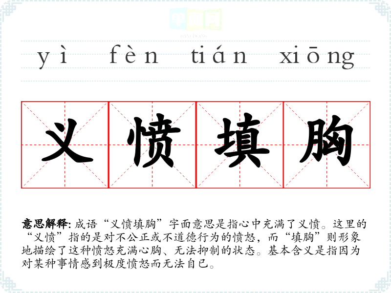 成语“义愤填胸”字面意思是指心中充满了义愤。这里的“义愤”指的是对不公正或不道德行为的愤怒,而“填胸”则形象地描绘了这种愤怒充满心胸、无法抑制的状态。基本含义是指因为对某种事情感到极度愤怒而无法自已。