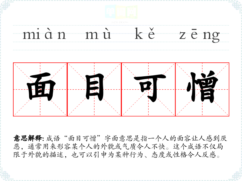 成语“面目可憎”字面意思是指一个人的面容让人感到厌恶,通常用来形容某个人的外貌或气质令人不快。这个成语不仅局限于外貌的描述,也可以引申为某种行为、态度或性格令人反感。