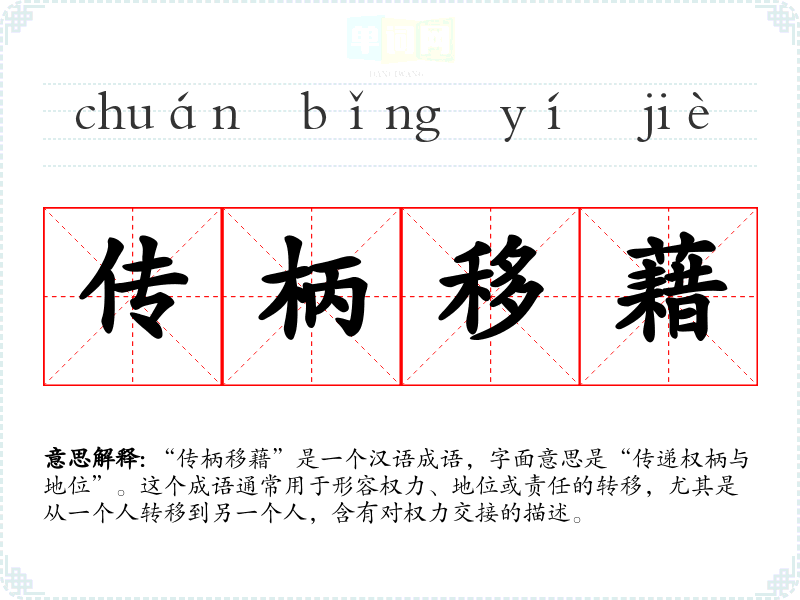 | 传柄移籍 | 柄:权力;籍:通“阼”,皇位。权势地位转移。 |