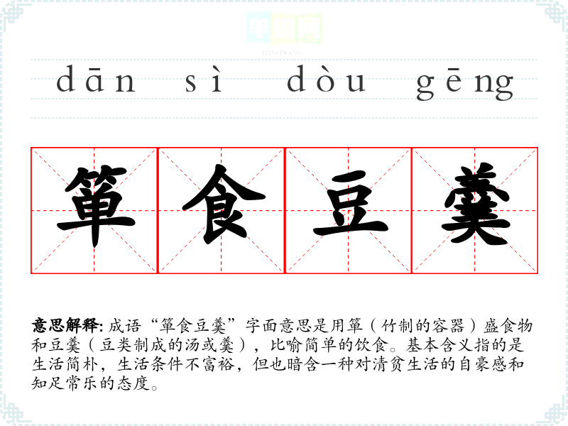 成语“箪食豆羹”字面意思是用箪(竹制的容器)盛食物和豆羹(豆类制成的汤或羹),比喻简单的饮食。基本含义指的是生活简朴,生活条件不富裕,但也暗含一种对清贫生活的自豪感和知足常乐的态度。