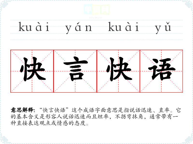 “快言快语”这个成语字面意思是指说话迅速、直率。它的基本含义是形容人说话迅速而且坦率,不拐弯抹角,通常带有一种直接表达观点或情感的态度。