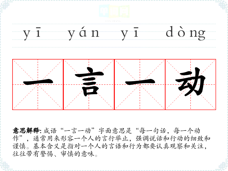 “一言一动”并没有明确的历史典故,但其构成的字词在古代文献中多有出现。“言”和“动”的组合反映了中华文化中对语言和行为的重视。古人常以“言行”作为道德标准的体现,因此成语的使用也体现了对言行一致的期望。