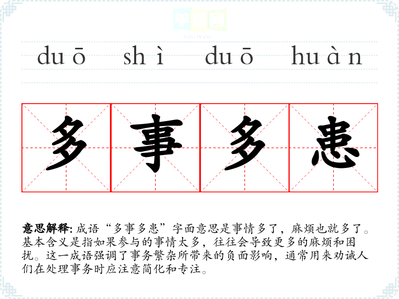 成语“多事多患”字面意思是事情多了,麻烦也就多了。基本含义是指如果参与的事情太多,往往会导致更多的麻烦和困扰。这一成语强调了事务繁杂所带来的负面影响,通常用来劝诫人们在处理事务时应注意简化和专注。