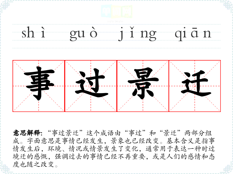 “事过景迁”这个成语由“事过”和“景迁”两部分组成。字面意思是事情已经发生,景象也已经改变。基本含义是指事情发生后,环境、情况或情景发生了变化,通常用于表达一种时过境迁的感慨,强调过去的事情已经不再重要,或是人们的感情和态度也随之改变。