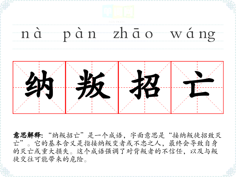 “纳叛招亡”是一个成语,字面意思是“接纳叛徒招致灭亡”。它的基本含义是指接纳叛变者或不忠之人,最终会导致自身的灭亡或重大损失。这个成语强调了对背叛者的不信任,以及与叛徒交往可能带来的危险。
