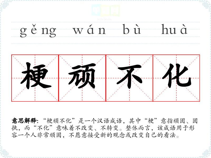 “梗顽不化”是一个汉语成语,其中“梗”意指顽固、固执,而“不化”意味着不改变、不转变。整体而言,该成语用于形容一个人非常顽固,不愿意接受新的观念或改变自己的看法。