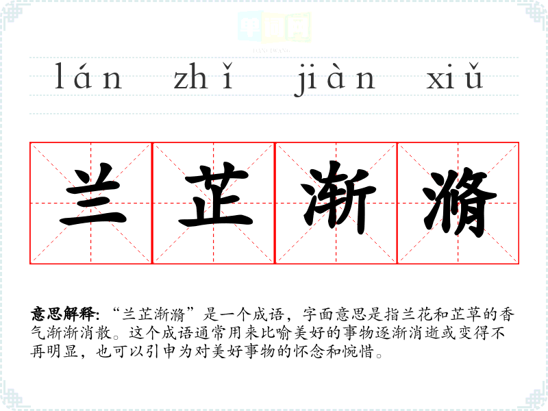 “兰芷渐滫”出自《楚辞·离骚》,原文中提到“既替余以蕙纕兮, 纡余以兰芷”,后面提到“兰芷渐滫”则用以形容美好事物的消逝。成语的历史背景与古代文人的情感表达密切相关,常常表现出对理想、青春或爱情的追忆与惋惜。