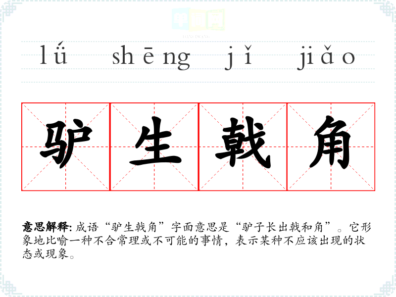 成语“驴生戟角”字面意思是“驴子长出戟和角”。它形象地比喻一种不合常理或不可能的事情,表示某种不应该出现的状态或现象。
