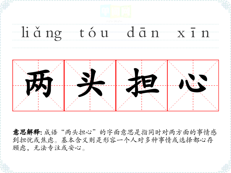 成语“两头担心”的字面意思是指同时对两方面的事情感到担忧或焦虑。基本含义则是形容一个人对多种事情或选择都心存顾虑,无法专注或安心。