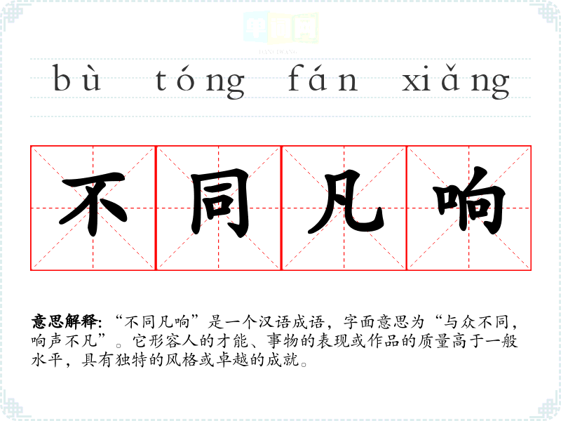 “不同凡响”是一个汉语成语,字面意思为“与众不同,响声不凡”。它形容人的才能、事物的表现或作品的质量高于一般水平,具有独特的风格或卓越的成就。
