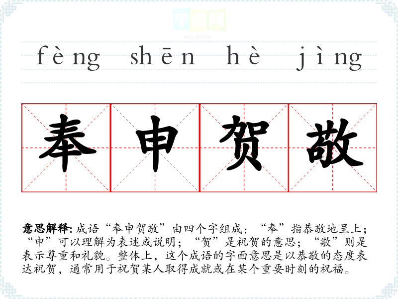 成语“奉申贺敬”由四个字组成:“奉”指恭敬地呈上;“申”可以理解为表述或说明;“贺”是祝贺的意思;“敬”则是表示尊重和礼貌。整体上,这个成语的字面意思是以恭敬的态度表达祝贺,通常用于祝贺某人取得成就或在某个重要时刻的祝福。