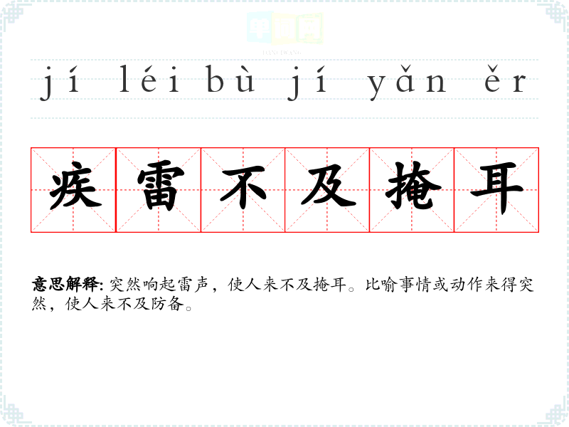 | 疾如雷电 | 快提就像雷鸣闪电。形容形势发展很迅速。 |