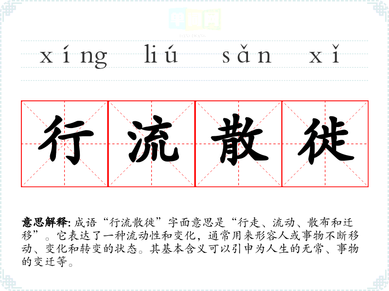 成语“行流散徙”字面意思是“行走、流动、散布和迁移”。它表达了一种流动性和变化,通常用来形容人或事物不断移动、变化和转变的状态。其基本含义可以引申为人生的无常、事物的变迁等。