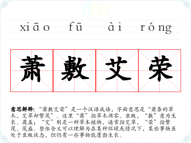 “萧敷艾荣”是一个汉语成语,字面意思是“萧条的草木,艾草却繁茂”。这里“萧”指草木凋零、衰败,“敷”意为生长、覆盖;“艾”则是一种草本植物,通常指艾草,“荣”指繁茂、茂盛。整体含义可以理解为在某种环境或情况下,某些事物虽处于衰败状态,但仍有一些事物能蓬勃生长。