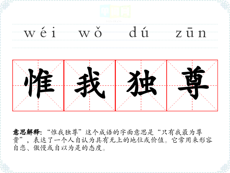 “惟我独尊”这个成语的字面意思是“只有我最为尊贵”,表达了一个人自认为具有无上的地位或价值。它常用来形容自恋、傲慢或自以为是的态度。