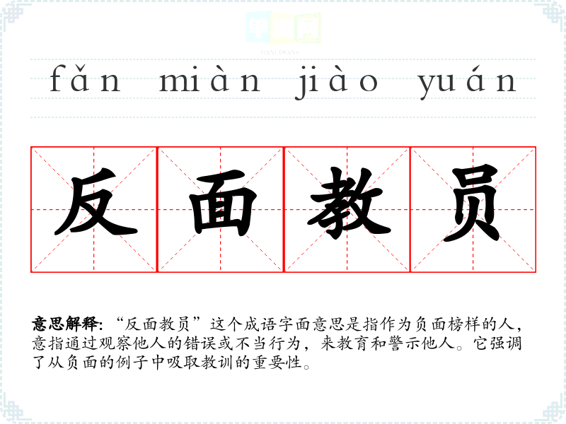 “反面教员”这个成语字面意思是指作为负面榜样的人,意指通过观察他人的错误或不当行为,来教育和警示他人。它强调了从负面的例子中吸取教训的重要性。