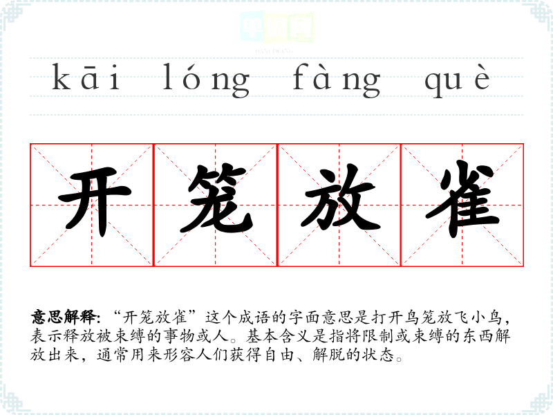 “开笼放雀”这个成语的字面意思是打开鸟笼放飞**,表示释放被束缚的事物或人。基本含义是指将限制或束缚的东西解放出来,通常用来形容人们获得自由、解脱的状态。