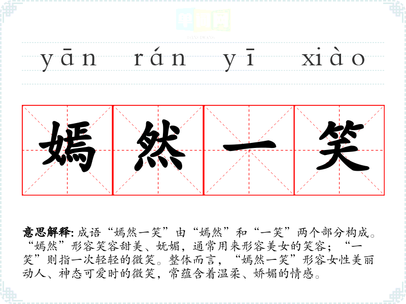 成语“嫣然一笑”由“嫣然”和“一笑”两个部分构成。“嫣然”形容笑容甜美、妩媚,通常用来形容美女的笑容;“一笑”则指一次轻轻的微笑。整体而言,“嫣然一笑”形容女性美丽动人、神态可爱时的微笑,常蕴含着温柔、娇媚的情感。