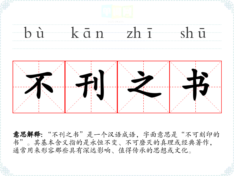 “不刊之书”是一个汉语成语,字面意思是“不可刻印的书”。其基本含义指的是永恒不变、不可磨灭的真理或经典著作,通常用来形容那些具有深远影响、值得传承的思想或文化。