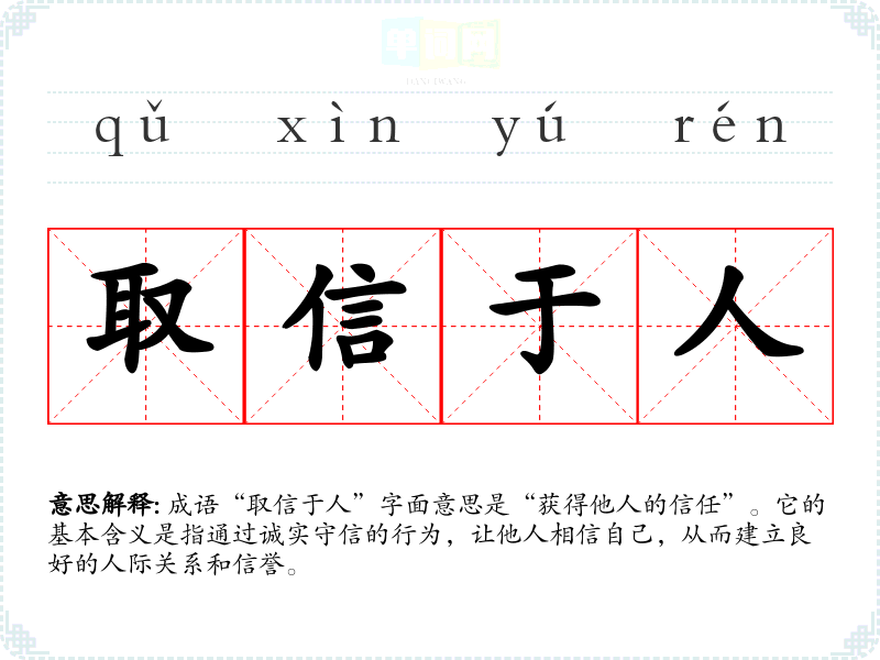 成语“取信于人”字面意思是“获得他人的信任”。它的基本含义是指通过诚实守信的行为,让他人相信自己,从而建立良好的人际关系和信誉。