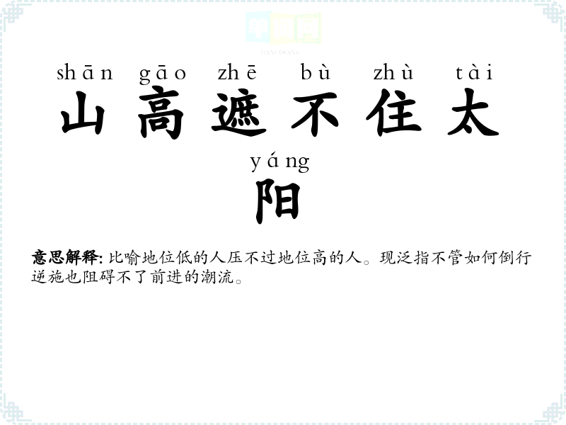 | 山高遮不住太阳 | 比喻地位低的人压不过地位高的人。现泛指不管如何倒行逆施也阻碍不了前进的潮流。 |