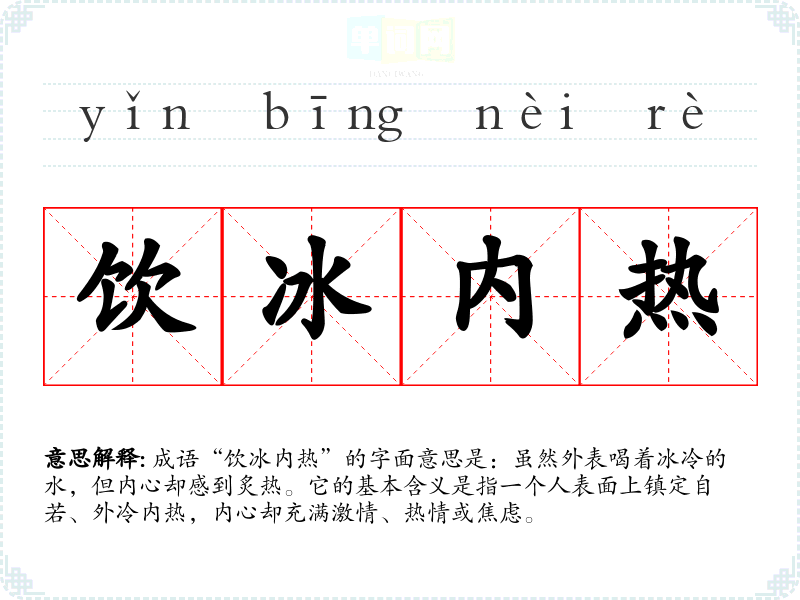 成语“饮冰内热”的字面意思是:虽然外表喝着冰冷的水,但内心却感到炙热。它的基本含义是指一个人表面上镇定自若、外冷内热,内心却充满激情、热情或焦虑。