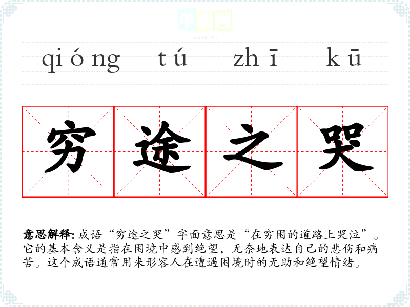 成语“穷途之哭”字面意思是“在穷困的道路上哭泣”。它的基本含义是指在困境中感到绝望,无奈地表达自己的悲伤和痛苦。这个成语通常用来形容人在遭遇困境时的无助和绝望情绪。