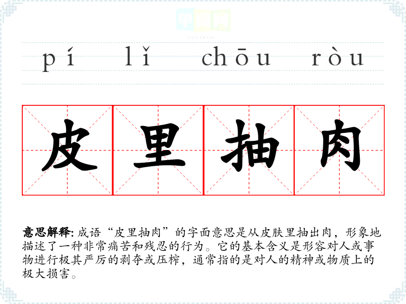 成语“皮里抽肉”的字面意思是从皮肤里抽出肉,形象地描述了一种非常痛苦和残忍的行为。它的基本含义是形容对人或事物进行极其严厉的剥夺或压榨,通常指的是对人的精神或物质上的极大损害。