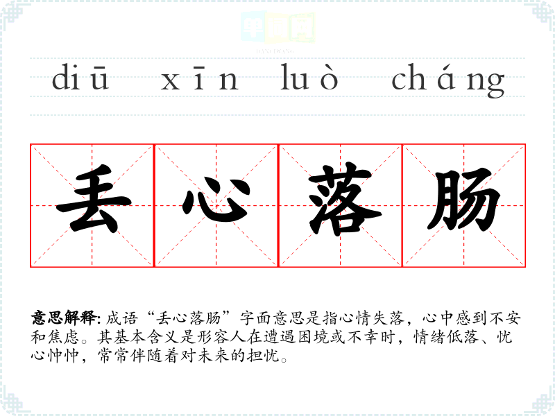 成语“丢心落肠”字面意思是指心情失落,心中感到不安和焦虑。其基本含义是形容人在遭遇困境或不幸时,情绪低落、忧心忡忡,常常伴随着对未来的担忧。