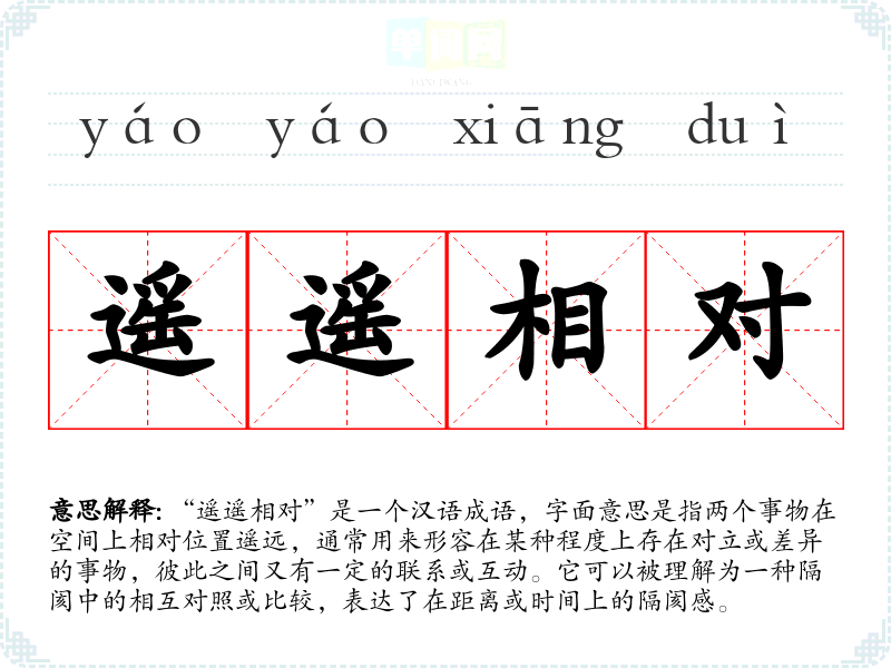 “遥遥相对”是一个汉语成语,字面意思是指两个事物在空间上相对位置遥远,通常用来形容在某种程度上存在对立或差异的事物,彼此之间又有一定的联系或互动。它可以被理解为一种隔阂中的相互对照或比较,表达了在距离或时间上的隔阂感。