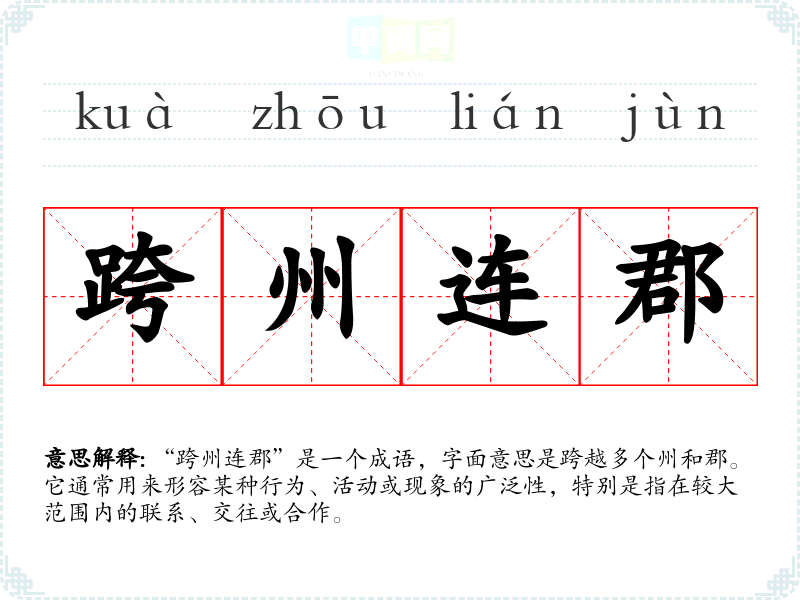 “跨州连郡”是一个成语,字面意思是跨越多个州和郡。它通常用来形容某种行为、活动或现象的广泛性,特别是指在较大范围内的联系、交往或合作。