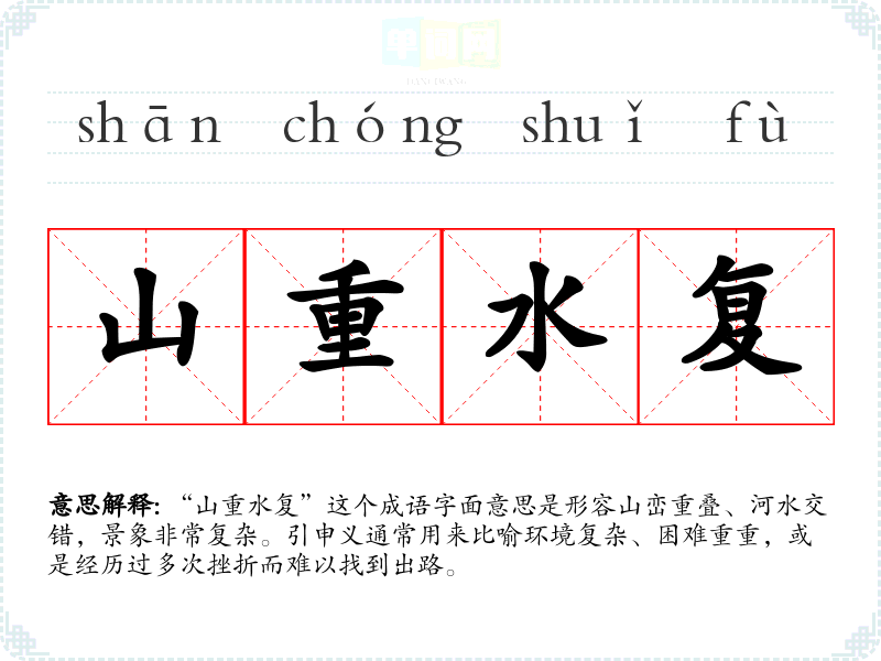 “山重水复”这个成语字面意思是形容山峦重叠、河水交错,景象非常复杂。引申义通常用来比喻环境复杂、困难重重,或是经历过多次挫折而难以找到出路。