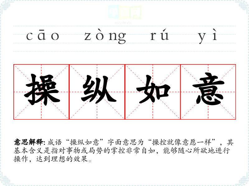 成语“操纵如意”字面意思为“操控就像意愿一样”,其基本含义是指对事物或局势的掌控非常自如,能够随心所欲地进行操作,达到理想的效果。