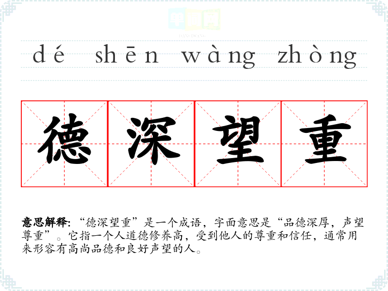 “德深望重”是一个成语,字面意思是“品德深厚,声望尊重”。它指一个人道德修养高,受到他人的尊重和信任,通常用来形容有高尚品德和良好声望的人。