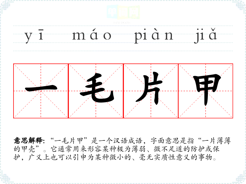 “一毛片甲”是一个汉语成语,字面意思是指“一片*的甲壳”。它通常用来形容某种极为弱、微不足道的防护或保护,广义上也可以引申为某种微小的、毫无实质性意义的事物。