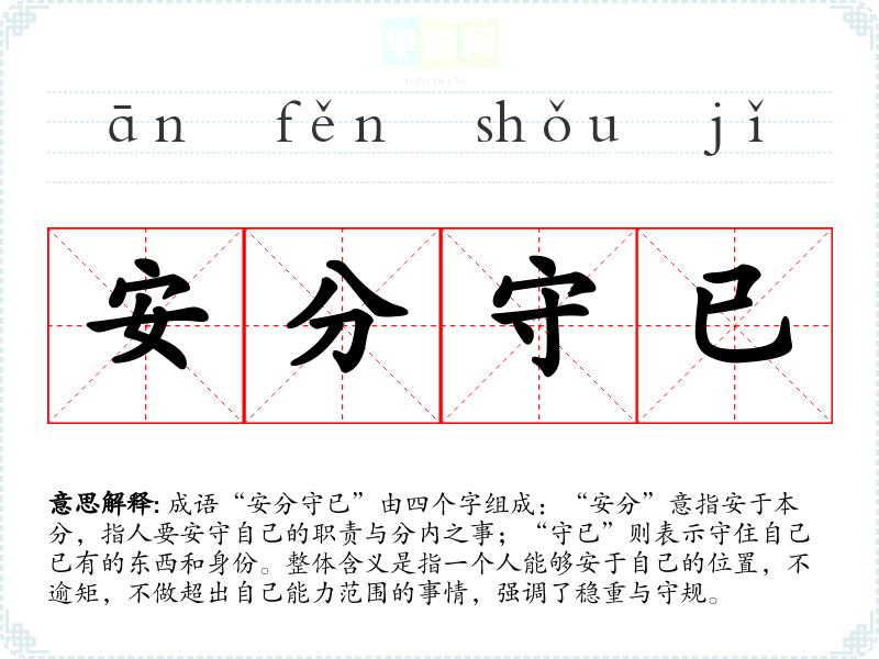成语“安分守已”由四个字组成:“安分”意指安于本分,指人要安守自己的职责与分内之事;“守已”则表示守住自己已有的东西和身份。整体含义是指一个人能够安于自己的位置,不逾矩,不做超出自己能力范围的事情,强调了稳重与守规。