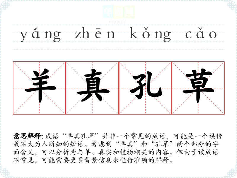 成语“羊真孔草”并非一个常见的成语,可能是一个误传或不太为人所知的短语。考虑到“羊真”和“孔草”两个部分的字面含义,可以分析为与羊、真实和植物相关的内容。但由于该成语不常见,可能需要更多背景信息来进行准确的解释。