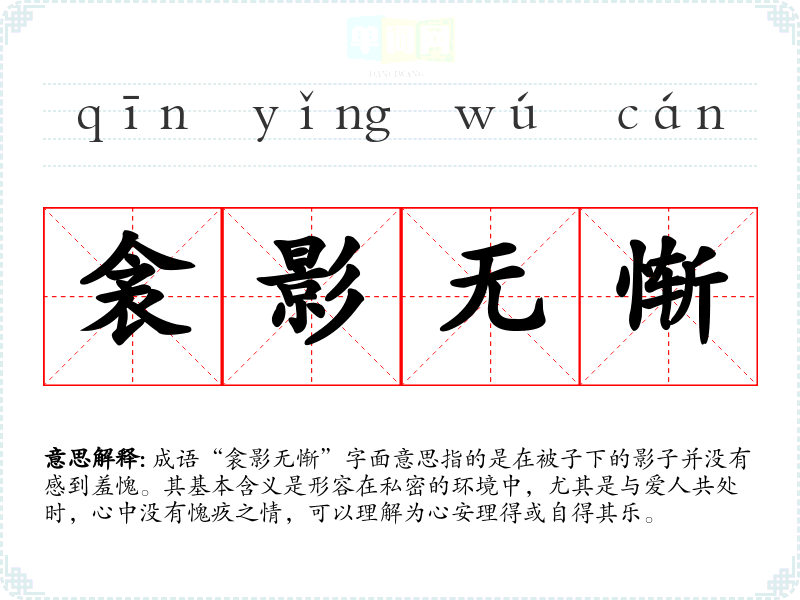 成语“衾影无惭”字面意思指的是在被子下的影子并没有感到羞愧。其基本含义是形容在私密的环境中,尤其是与爱人共处时,心中没有愧疚之情,可以理解为心安理得或自得其乐。