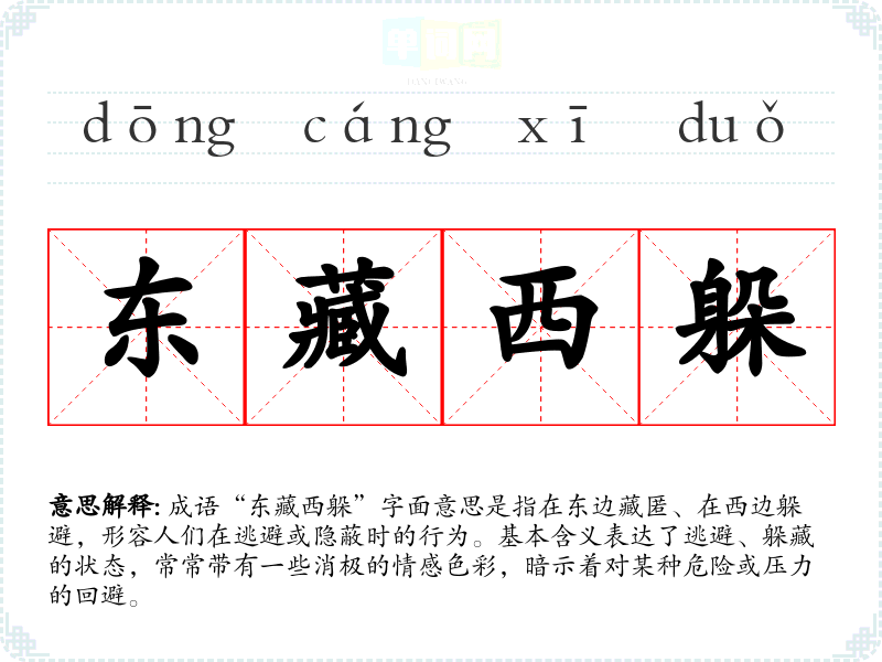 成语“东藏西躲”字面意思是指在东边藏匿、在西边躲避,形容人们在逃避或隐蔽时的行为。基本含义表达了逃避、躲藏的状态,常常带有一些消极的情感色彩,暗示着对某种危险或压力的回避。