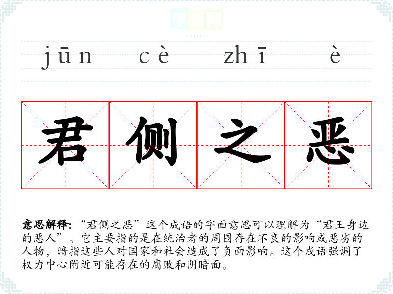 “君侧之恶”这个成语的字面意思可以理解为“君王身边的恶人”。它主要指的是在统治者的周围存在不良的影响或恶劣的人物,暗指这些人对国家和社会造成了负面影响。这个成语强调了权力中心附近可能存在的腐败和阴暗面。